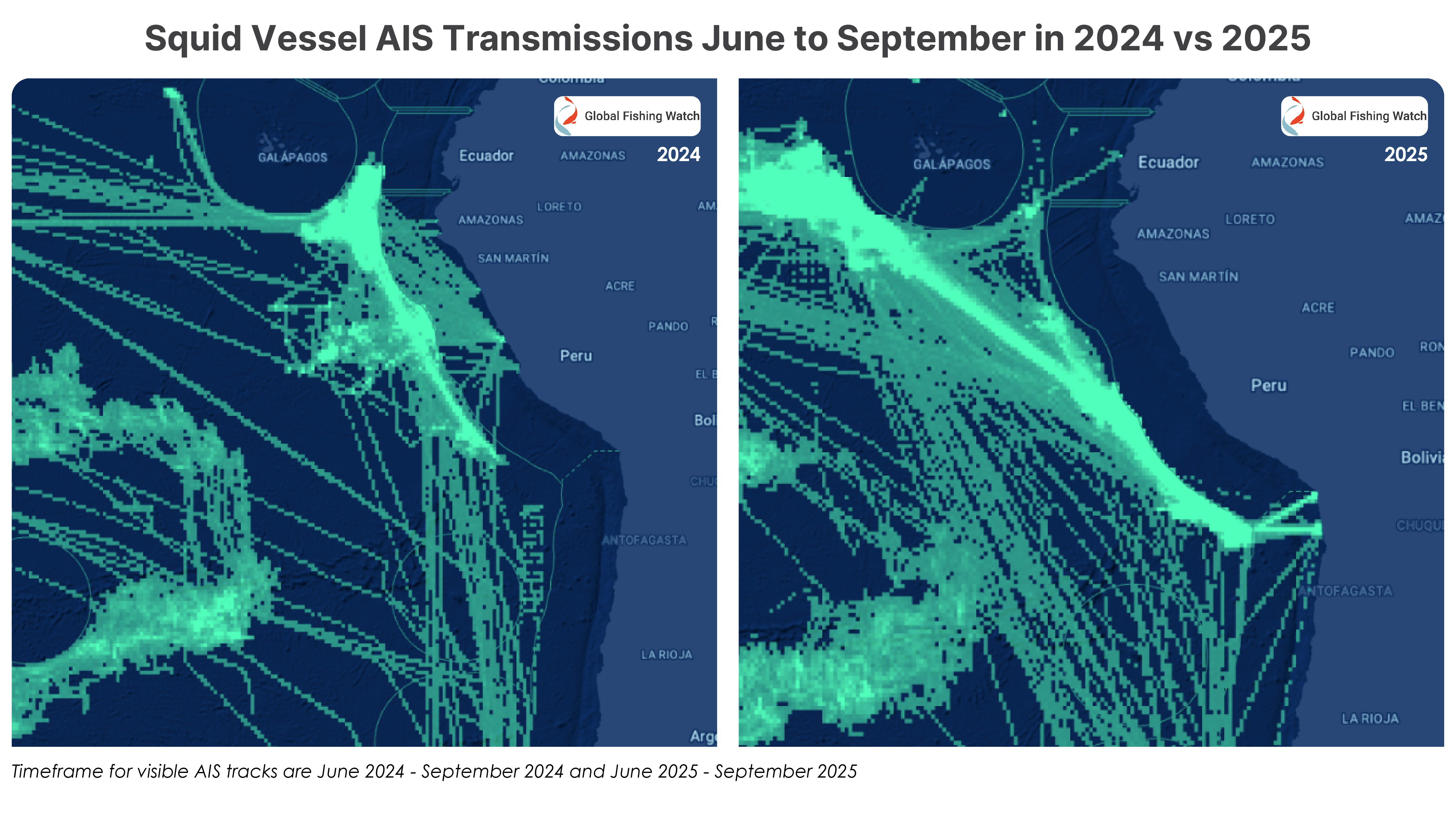 Chilean Port arrival records and AIS data indicate that port calls to Peru between June 1 and September 20 fell from more than 100 last year to 0 this year. As of the date of writing, not a single distant water squid vessel has landed in Peru.[4][5]