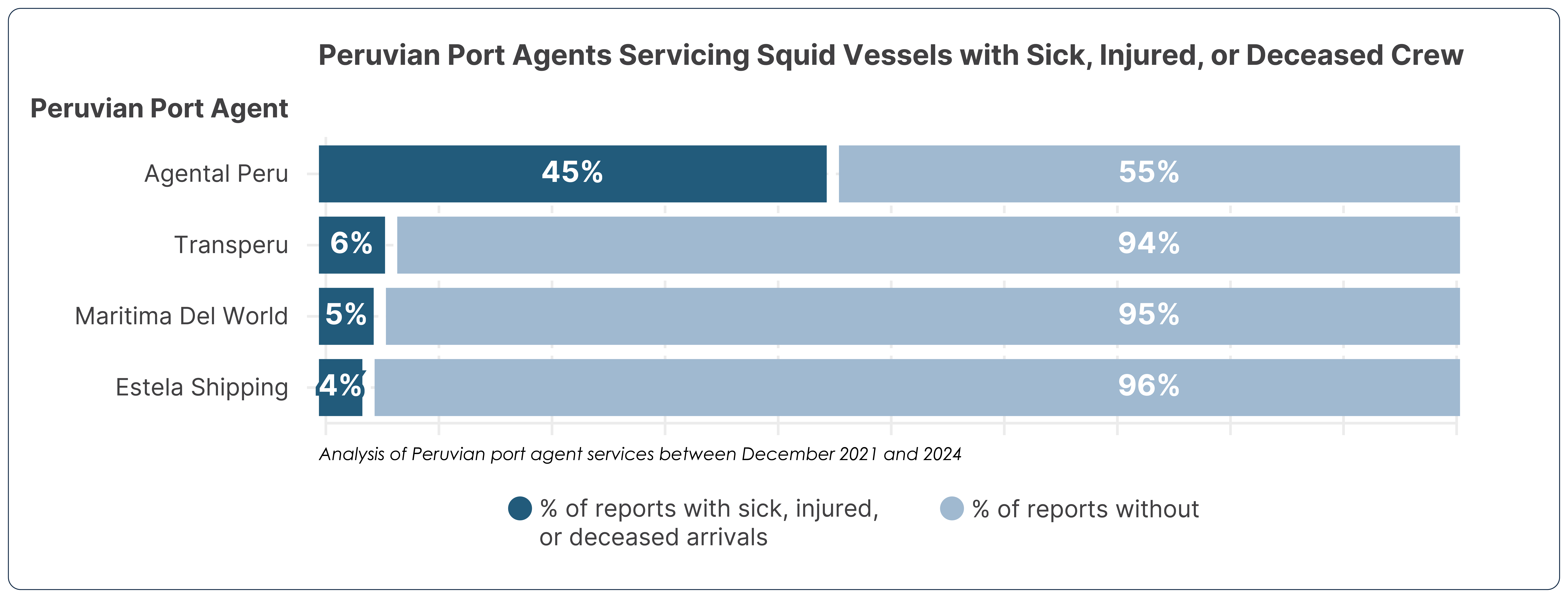 Agental has been linked to a disproportionate number of arrivals involving sick, injured, or deceased crew in Peru, raising questions about its role in obscuring or enabling potentially dubious fleet practices. [14] The ease with which the DWSF shifted to Agental’s Chilean operations underscores the fixture of enabler networks, which provide the communications and logistical infrastructure that help high-risk actors to quickly pivot across jurisdictions.