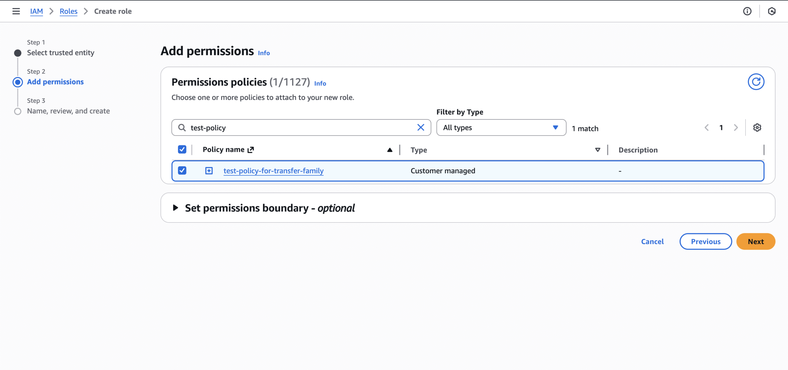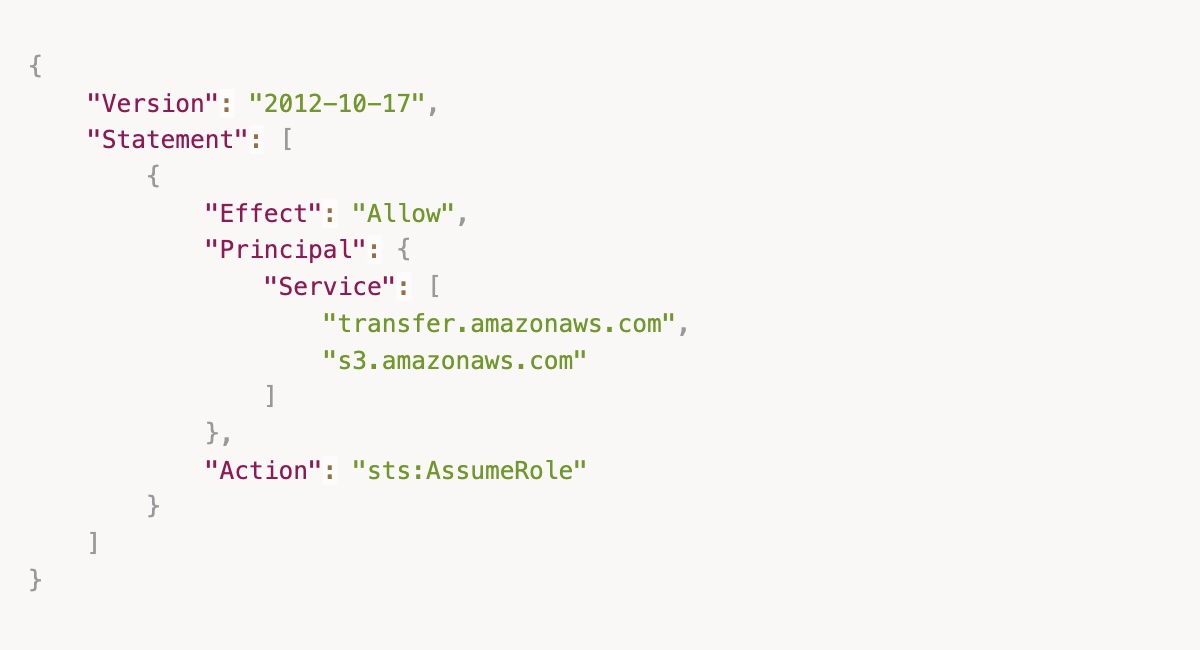 • Step 1: Select “Custom trust policy” for entity type, then enter in the JSON below. Instead of selecting “AWS service” and selecting the entity type, you should create a custom trust policy, which allows the usage of both Transfer Family and S3.