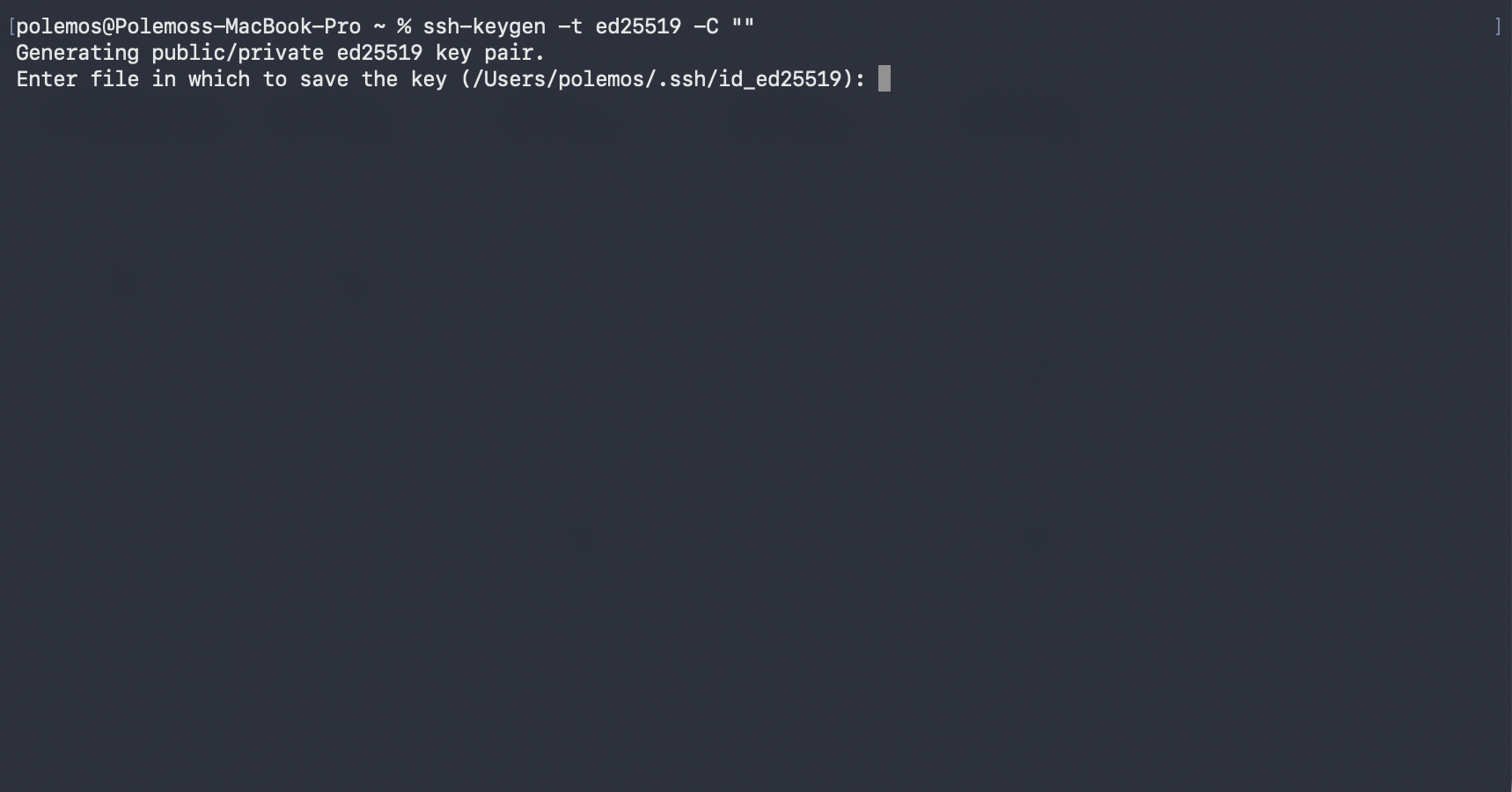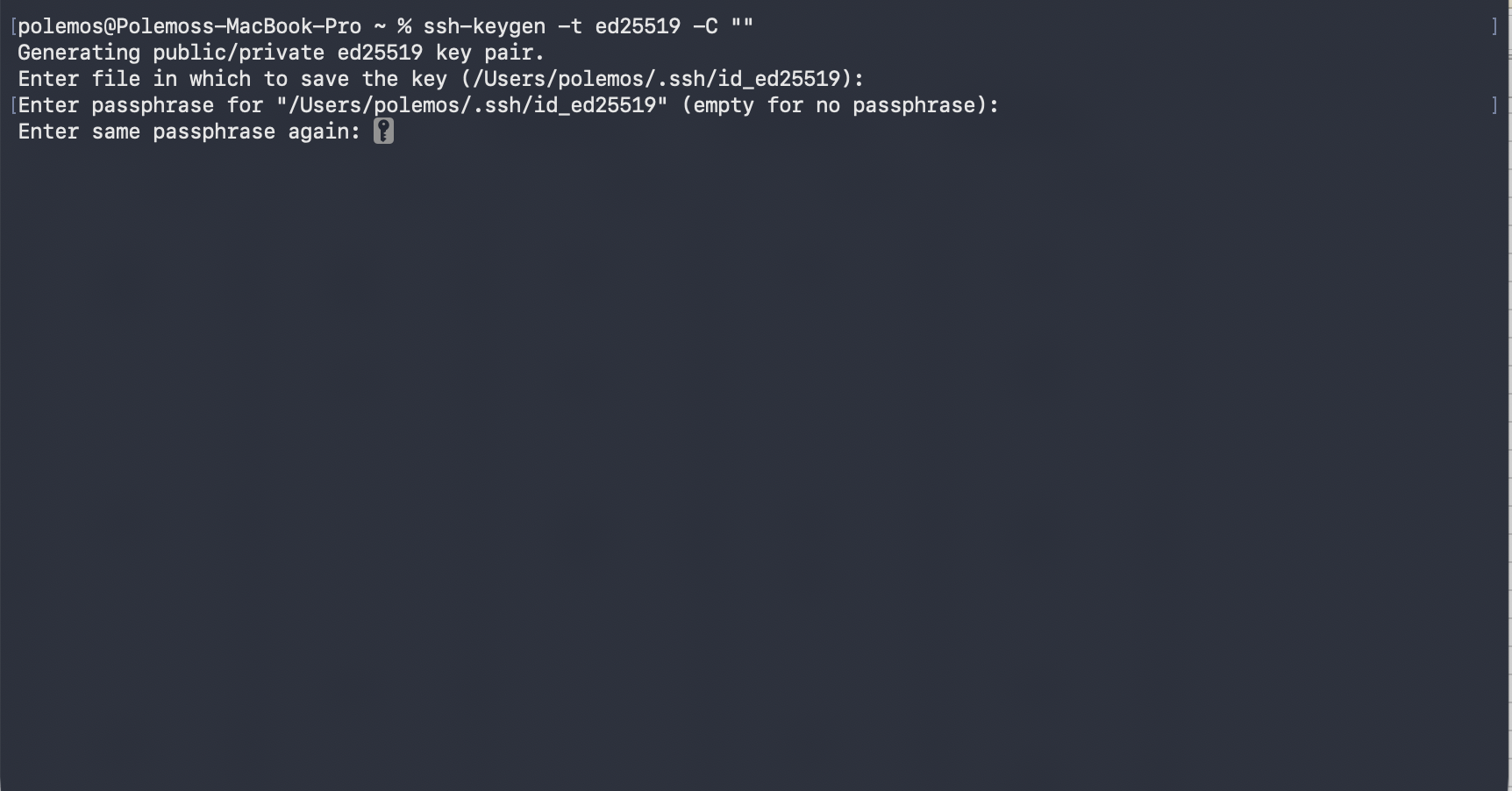 • It will then ask for a passphrase. For this guide, we will hit enter twice not to attach a passphrase.