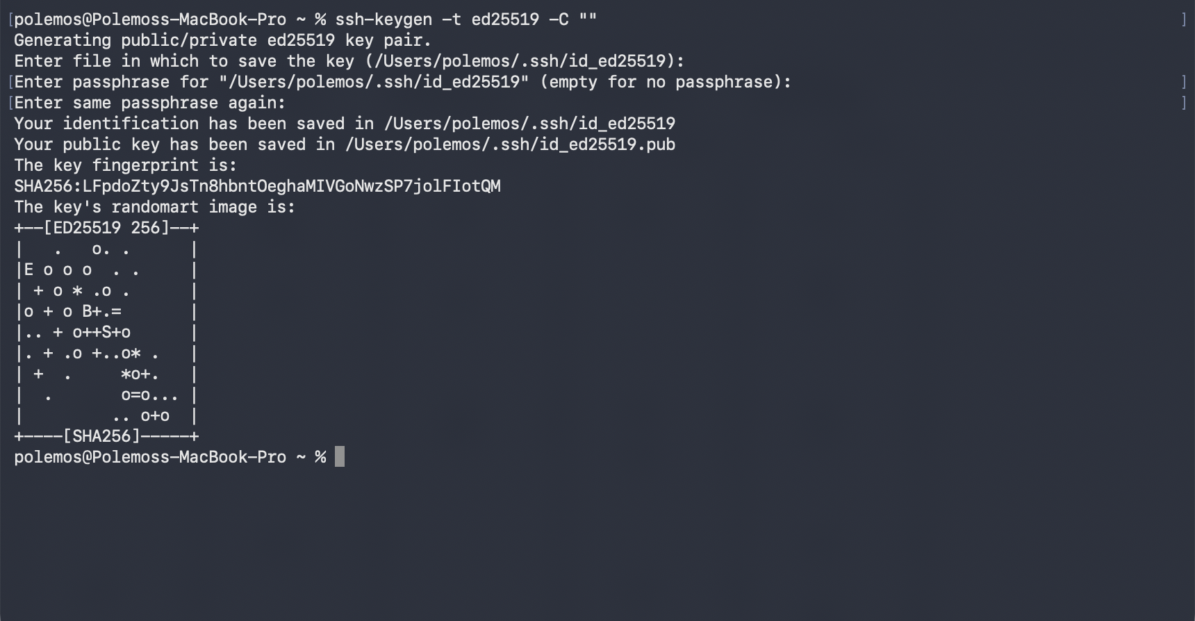 • If done correctly, you will see the fingerprint and randomart. If you are on MacOS, the key will be stored in the .ssh/ folder. [YO1] [KB2] By default, id_ed25519 will be the private key and id_ed25519.pub will be the public key.