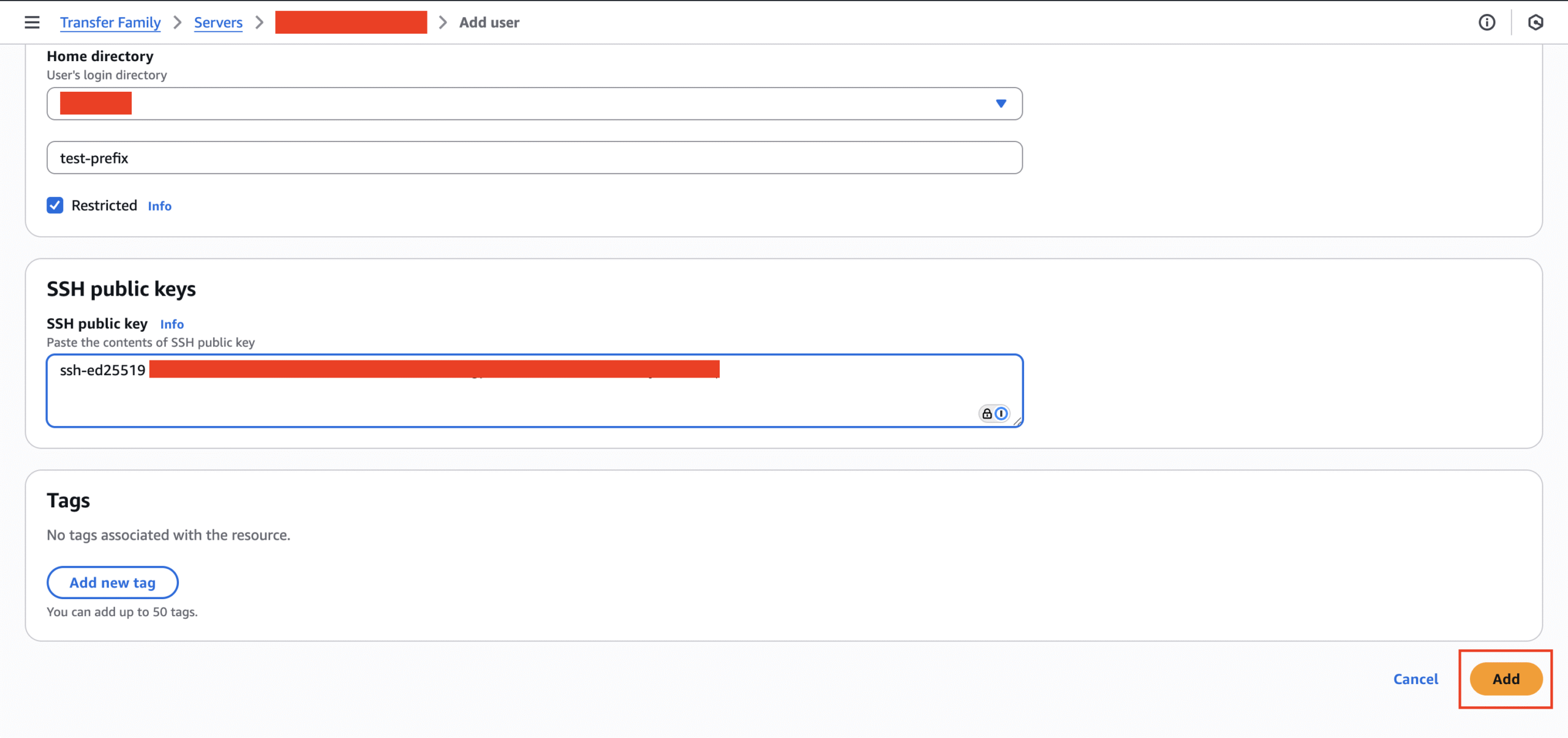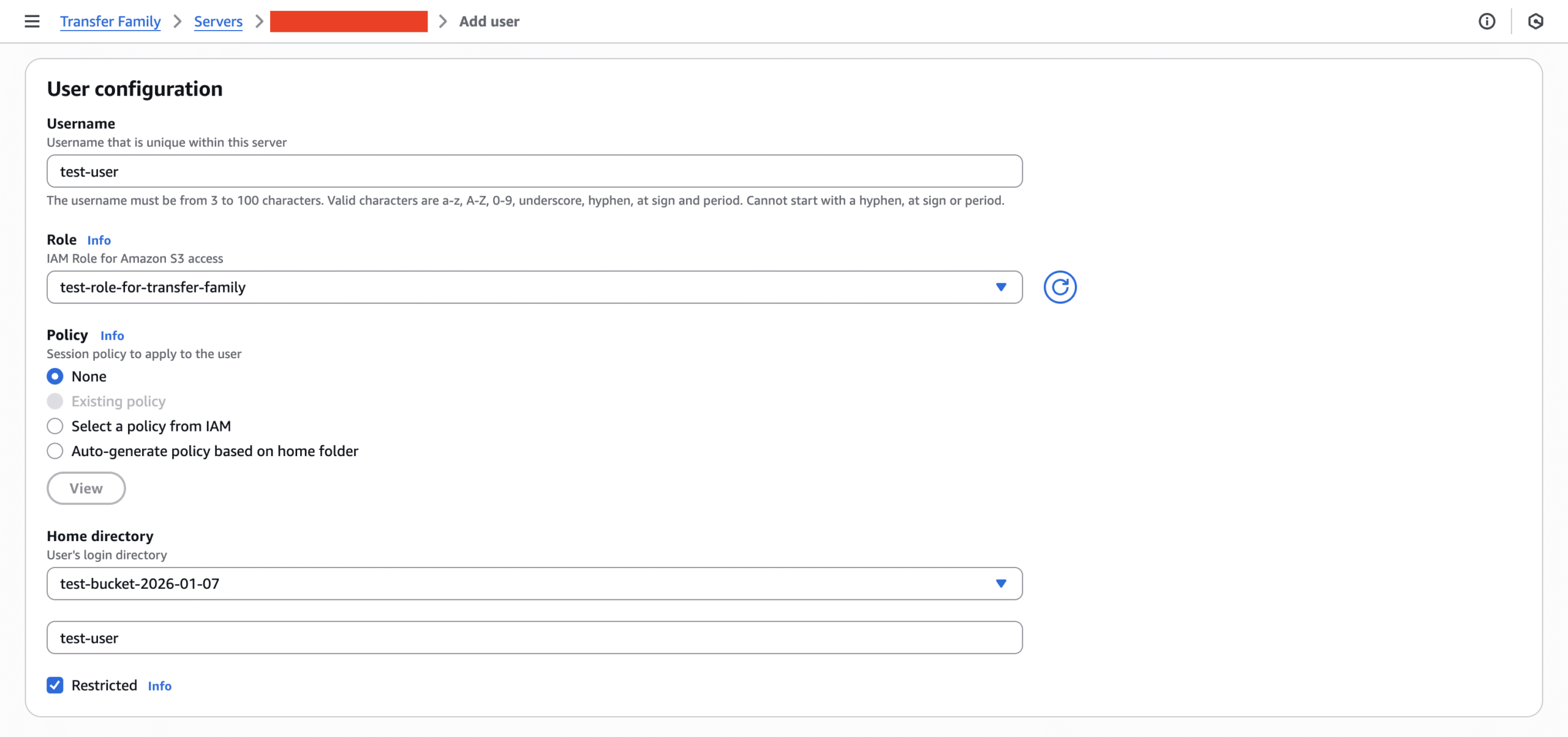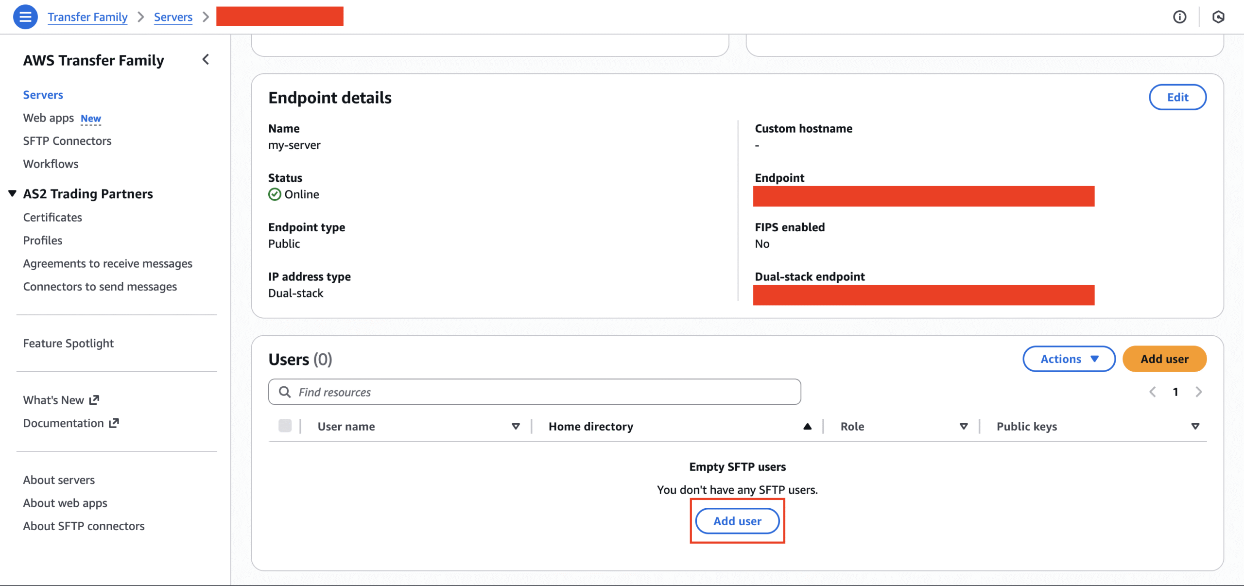 • Return to Transfer Family and select your server. Now, you should select “Add user.”