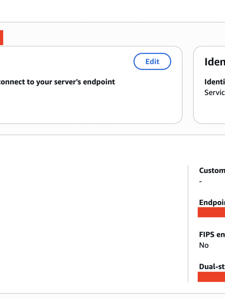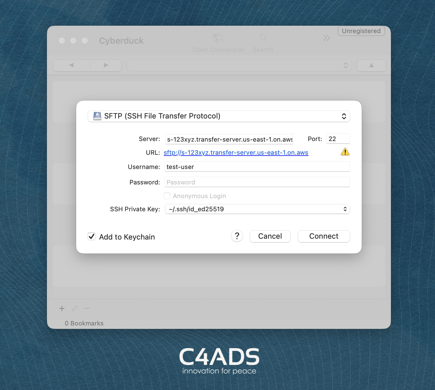 • For the server, you should enter in the dual-stack endpoint. It should be in the format of s-123xyz.transfer-server.us-east-1.on.aws