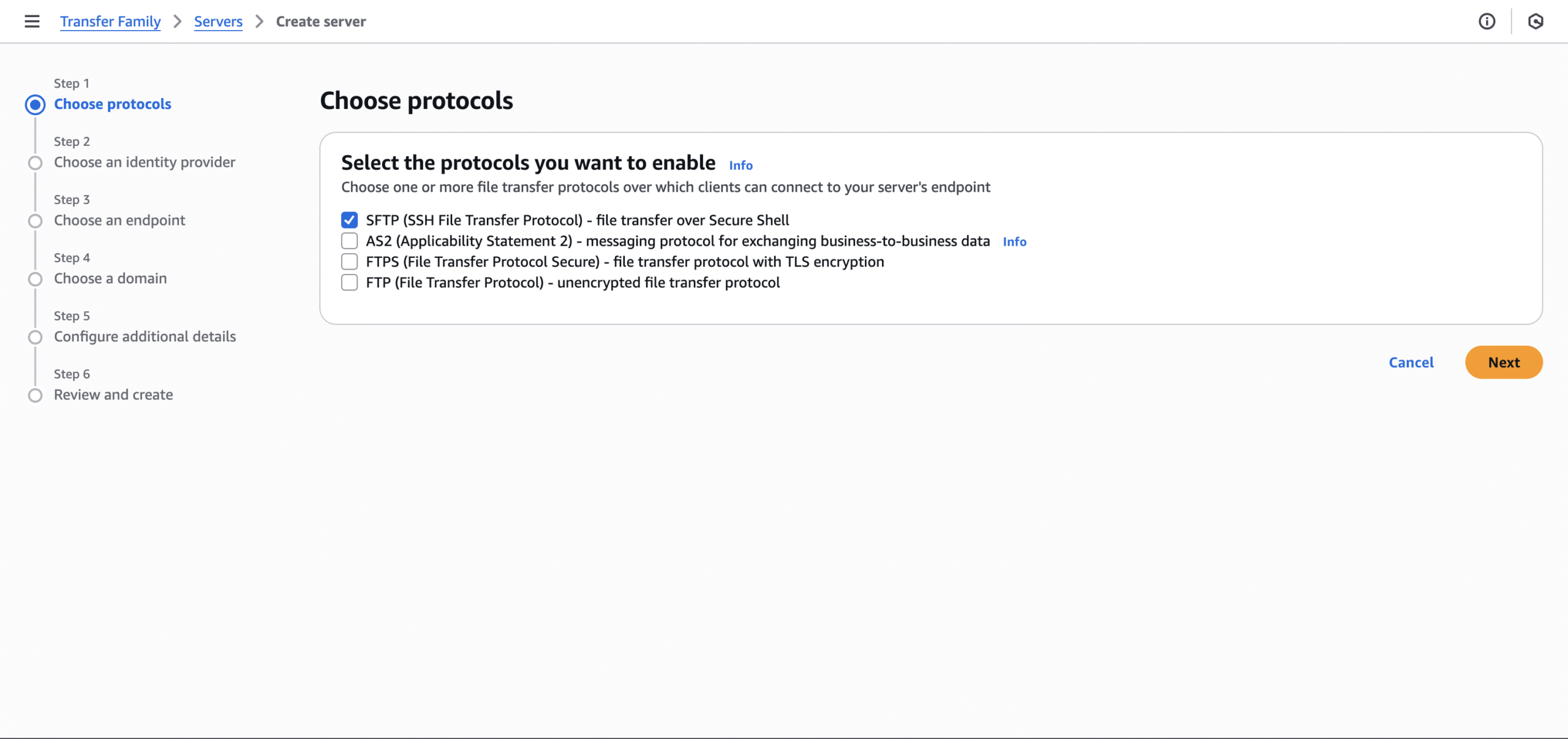 We selected SFTP from the protocols available through AWS Transfer Family because it has broader industry support than S3’s native protocol. SFTP was also a specific customer requirement, and Transfer Family offered the most straightforward implementation path.