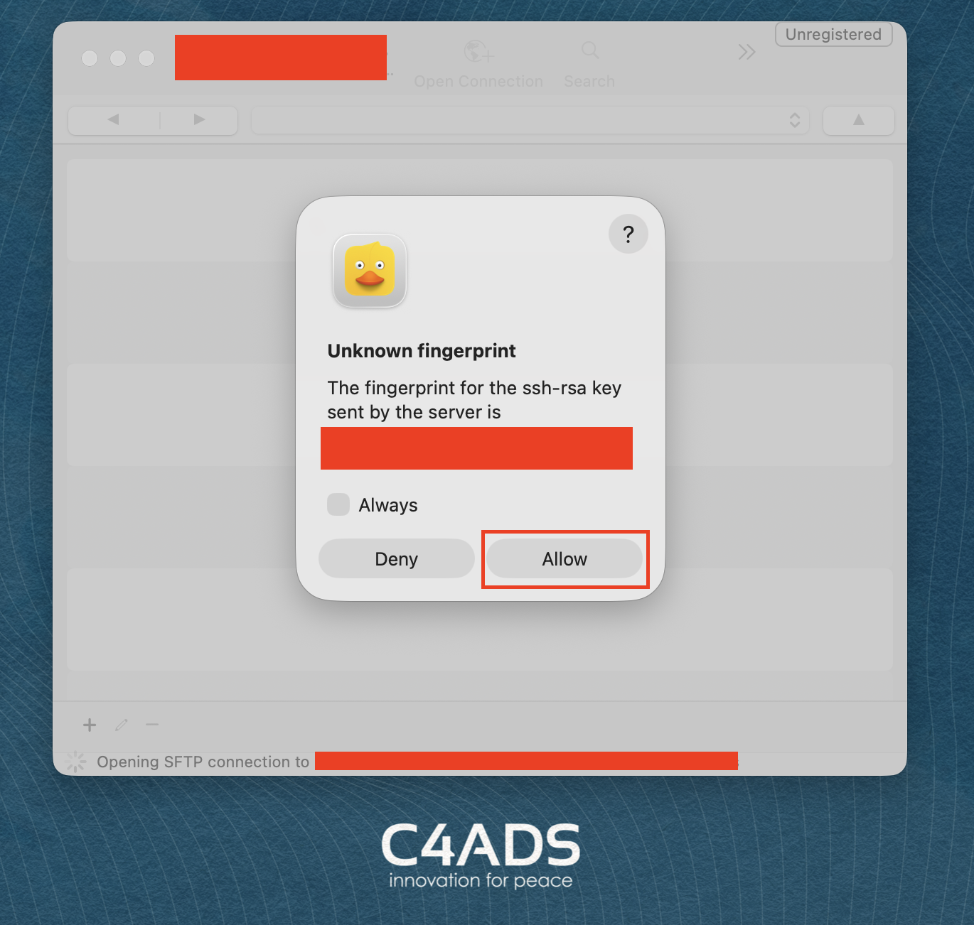 • You might see the message “Unknown fingerprint.” Select “Allow.”