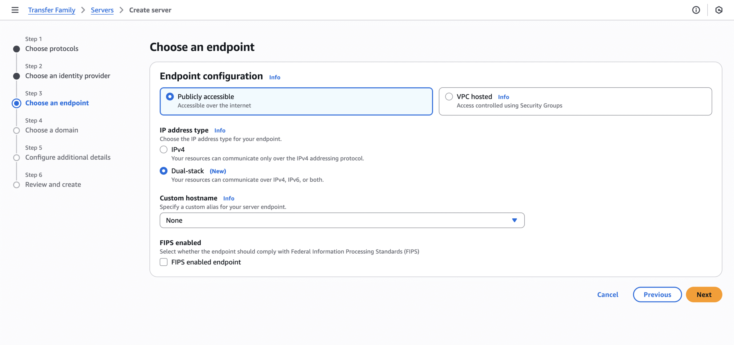 • Step 3: The endpoint should be publicly accessible. Here, select the “Dual-stack” IP address type. Certain SFTP clients, like Cyberduck, only work through IPv6. You can leave the rest of the options unchanged.