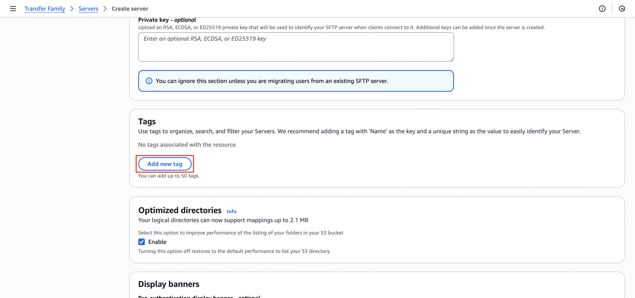 Upon creating the server, the console will state that you will need to add users to enable access. You must create an account for each end user within the Transfer Family server. This will require some IAM setup as well. It’s best practice to provide temporary, least-necessary privileges. This means you should grant access only to the data path the user needs, and remove their access from both the server and IAM Manager once the transfer is complete.