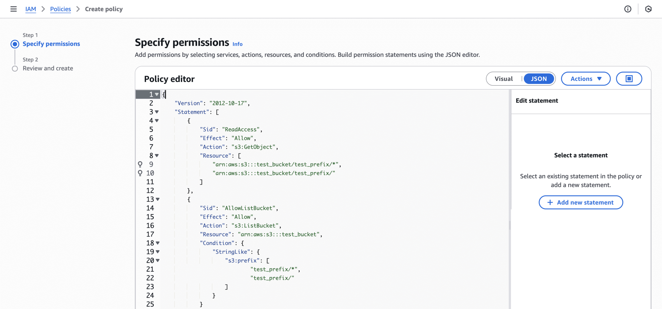 • Create an S3 bucket policy. Within IAM, create a policy that is based on this template. The JSON is below as well. If you are transferring all contents within a bucket, then specifying the bucket prefix is not necessary.